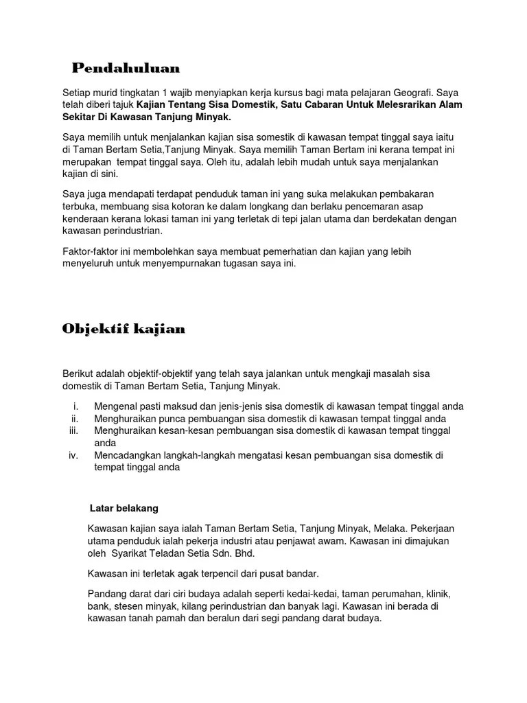 Contoh objektif kajian kerja lapangan geografi tingkatan 1 sisa domestik. Pendahuluan saya telah menjalankan kerja kursus geografi tingkatan 1 yang bertajuk kajian lapangan tentang "sisa domestik" di .